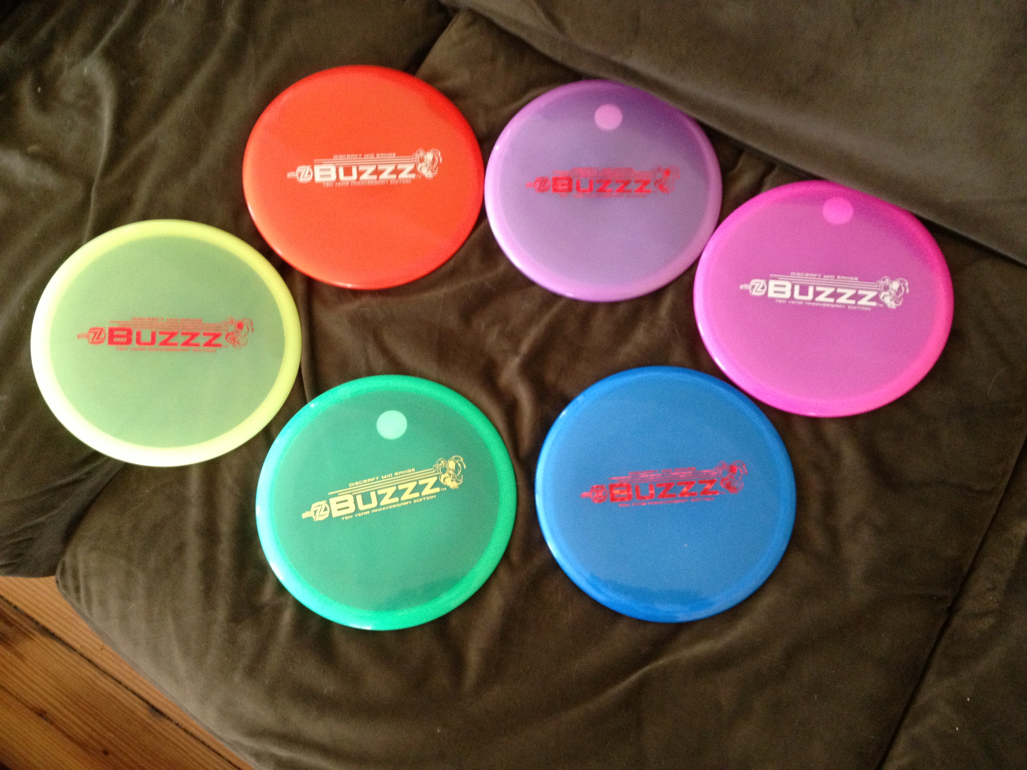 The reason I recommend to see them in person first is the difference in shape. The first thing everyone asks me about these discs is, “How flat is it?” Out of my six discs, two of them are domey for a Buzzz. Two of them are very flat. The last two are something in the middle- which is most similar to the originals that I already own. I’m not sure how their domes will effect flight, and I won’t find out for a long time, because I’m not going to throw all six immediately. I will most likely only throw two and keep the rest for back ups until I need them.